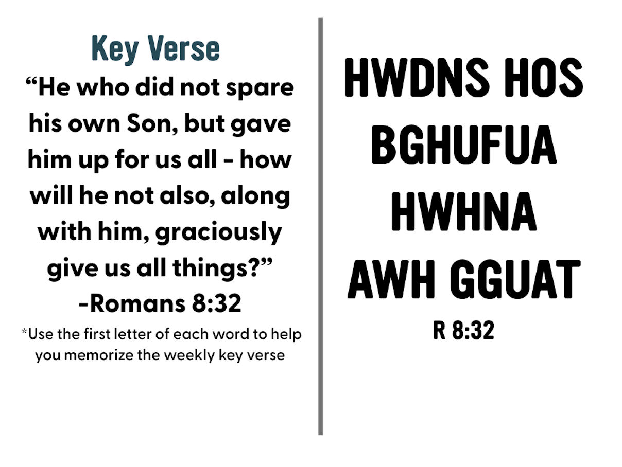 As part of our "More Than" series, we are encouraging you to memorize Scripture! If you are so inclined, we'd love for you to memorize all of chapter 8 of Romans. If not, we would love for you to memorize each week's key verse. The card above is given to help you with your efforts to memorize each week.