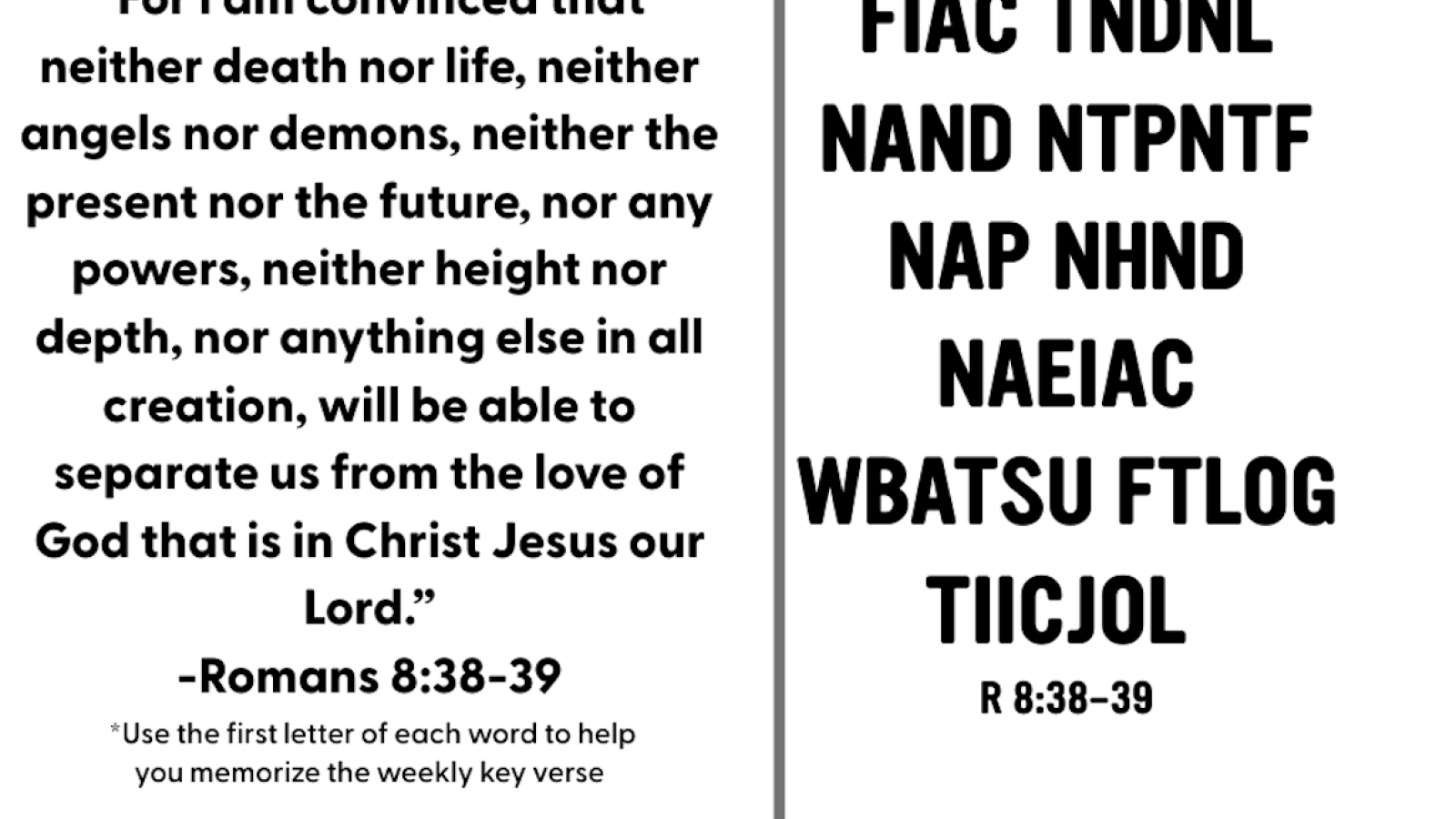 If you are memorizing the whole chapter, your weekly challenge is Romans 8:35-39: