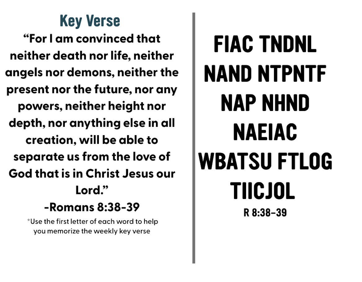 As part of our "More Than" series, we are encouraging you to memorize Scripture! If you are so inclined, we'd love for you to memorize all of chapter 8 of Romans. If not, we would love for you to memorize each week's key verse. The card above is given to help you with your efforts to memorize each week.
